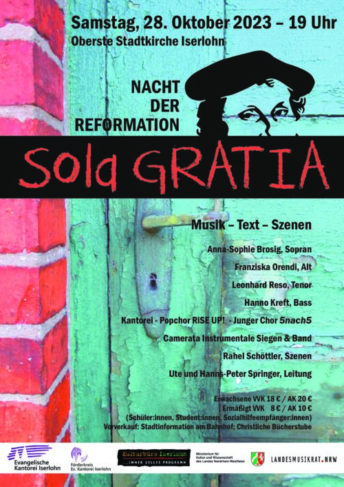Samstag, 28. Oktober 2023 – 19 Uhr Oberste Stadtkirche Sola Gratia – Nacht der Reformation Musik, Text, Szenerien Werke von Johann Sebastian Bach, Heinrich Schütz, Matthias Nagel Ev. Kantorei Iserlohn PopChor RiSE UP! Junger Chor 5nach5 Orchester und Band Ute und Hanns-Peter Springer, Leitung Karten sind ab sofort in der Christlichen Bücherstube sowie in der…